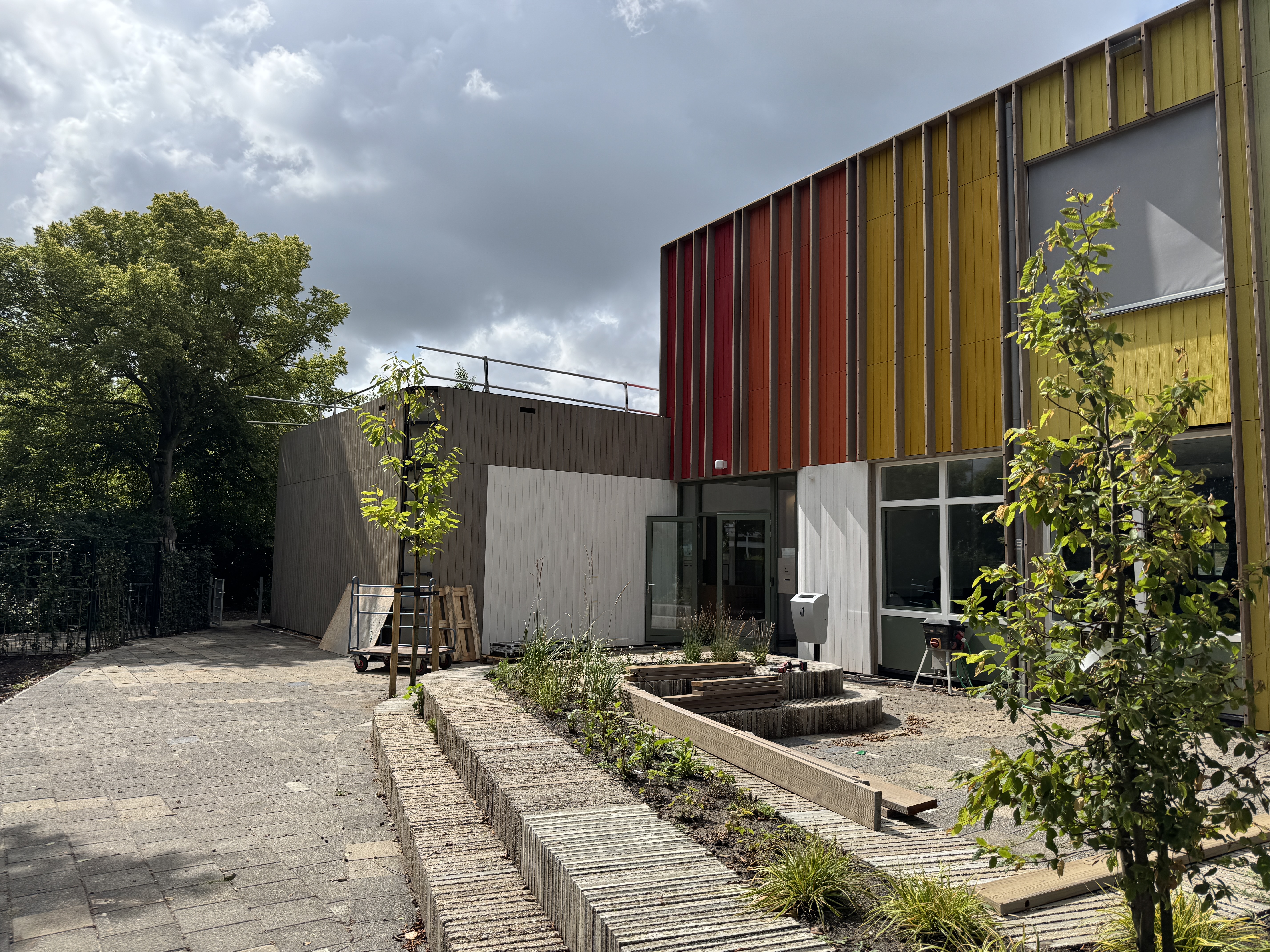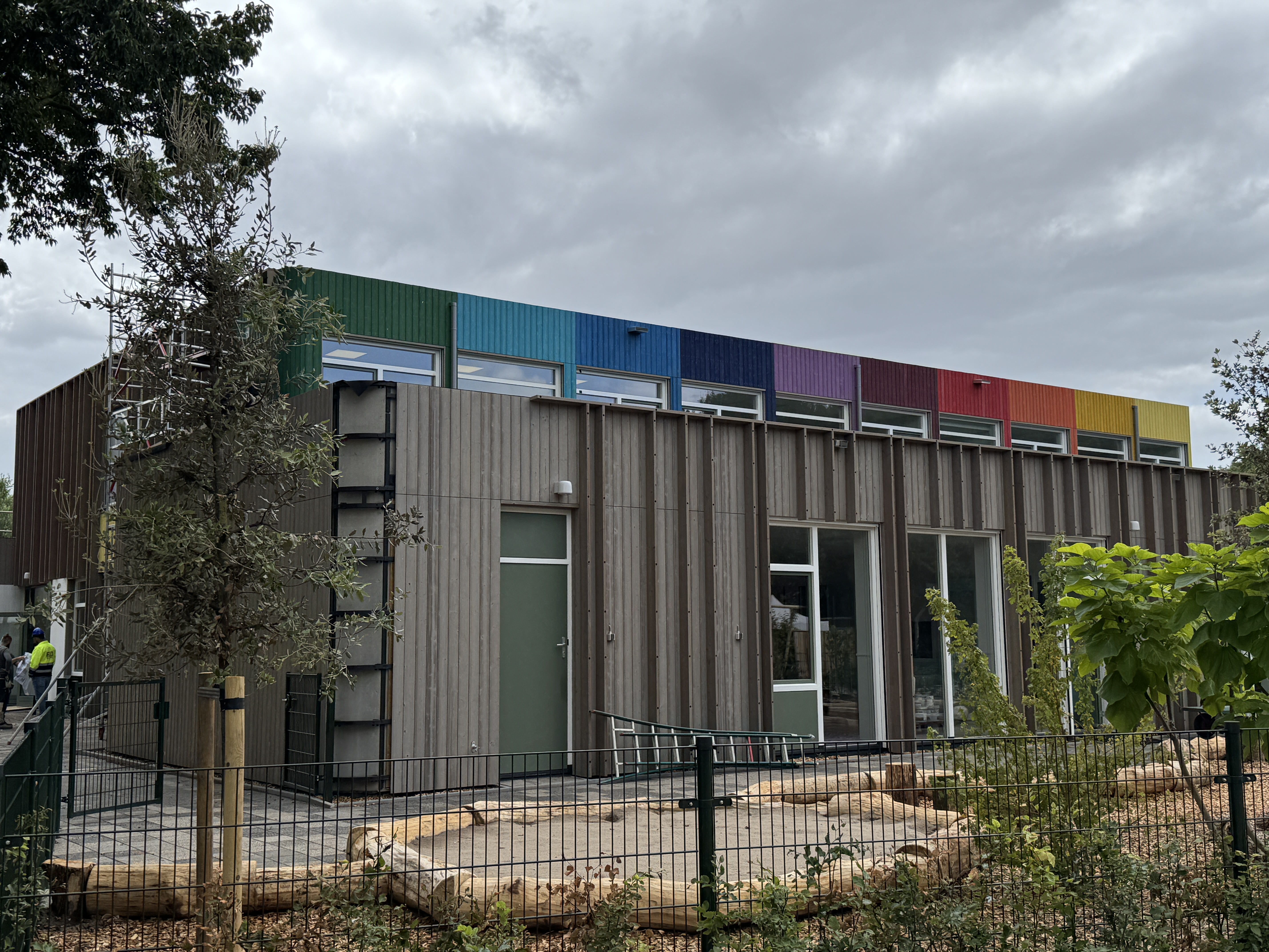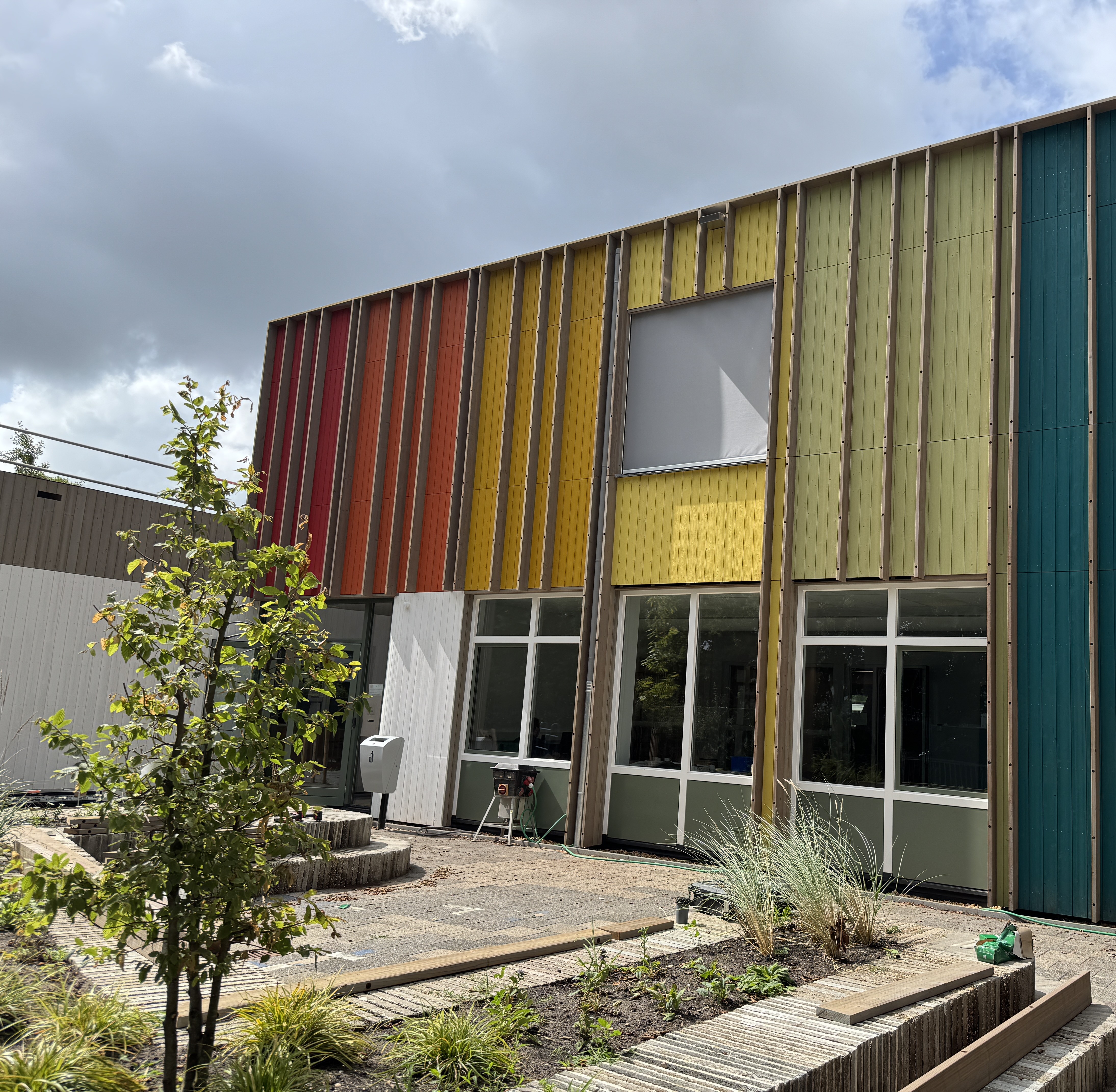 De gevel is opgebouwd uit thermisch gemodificeerd naaldhout, zorgvuldig toegepast in twee verschillende profielen. Door het gebruik van meerdere kleuren ontstaat een levendig gevelbeeld dat bijdraagt aan de identiteit van het gebouw: