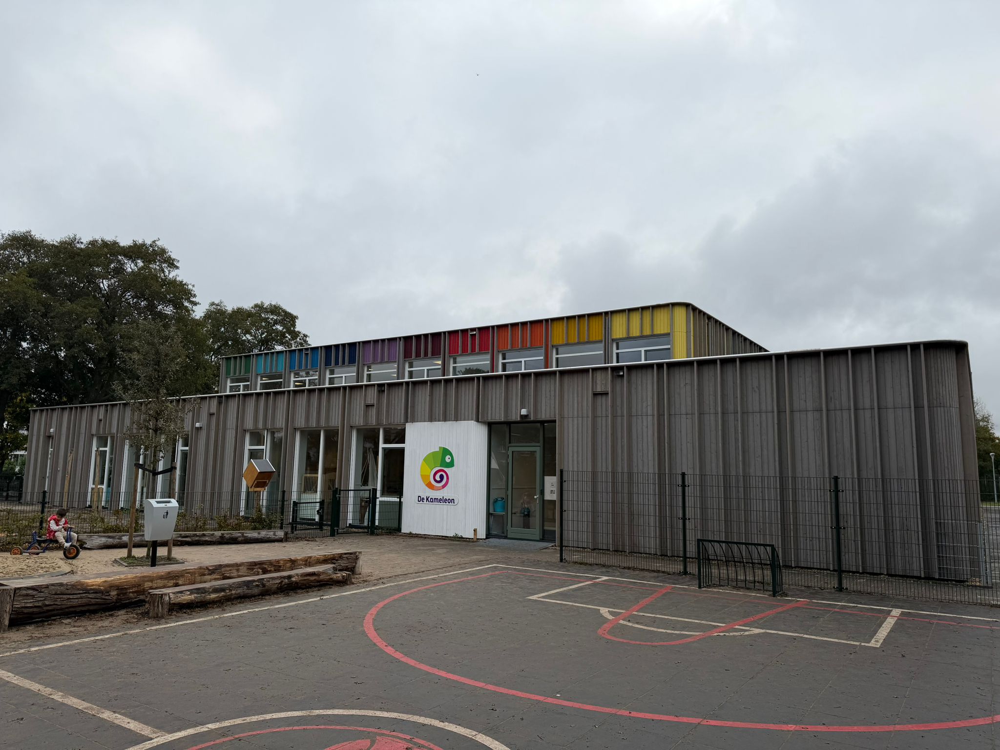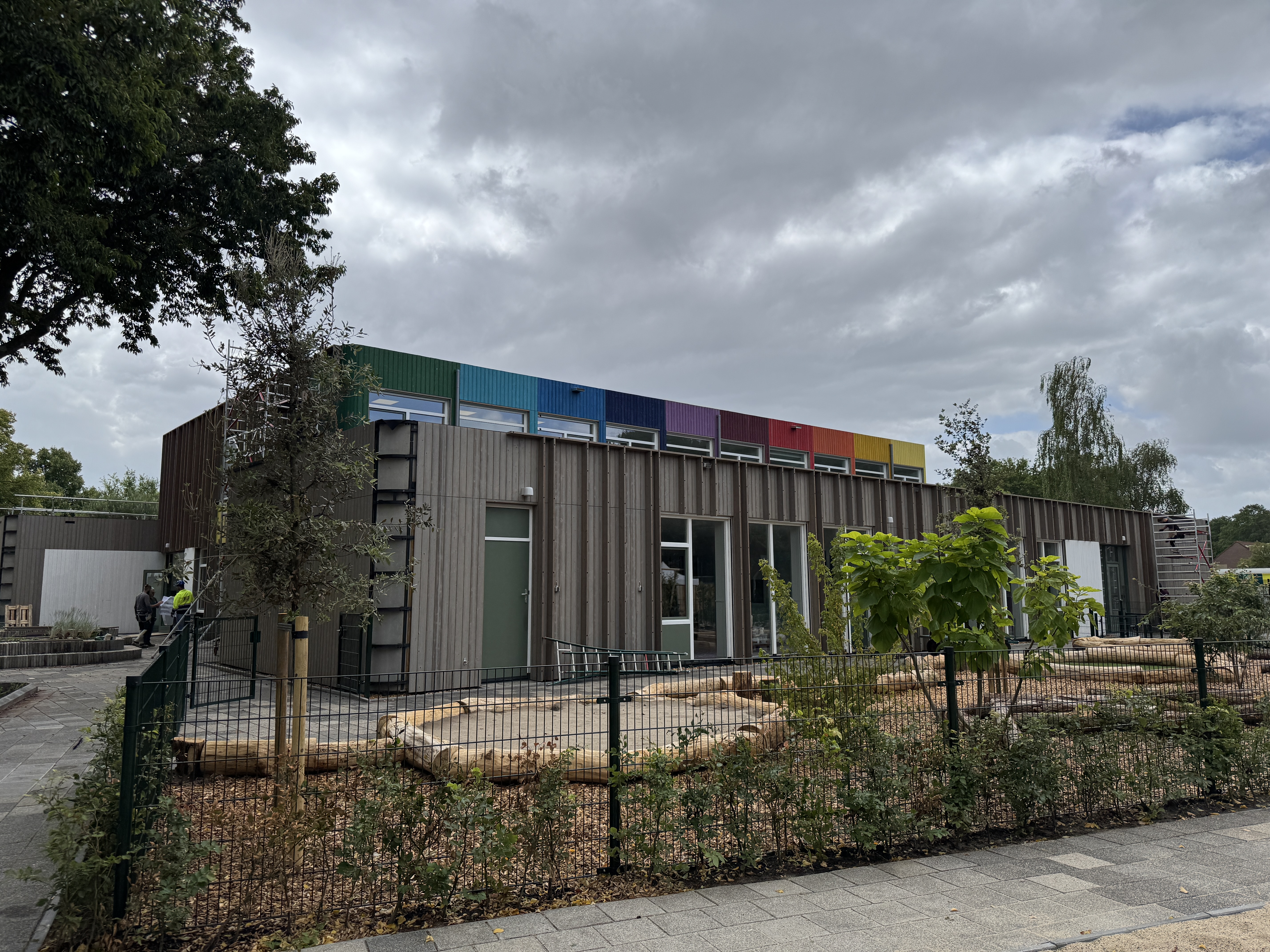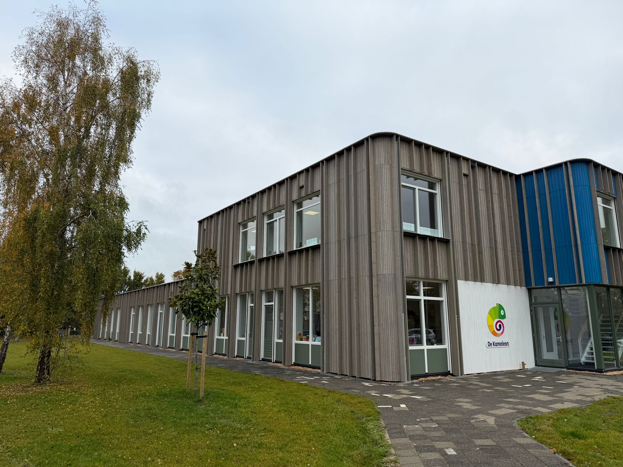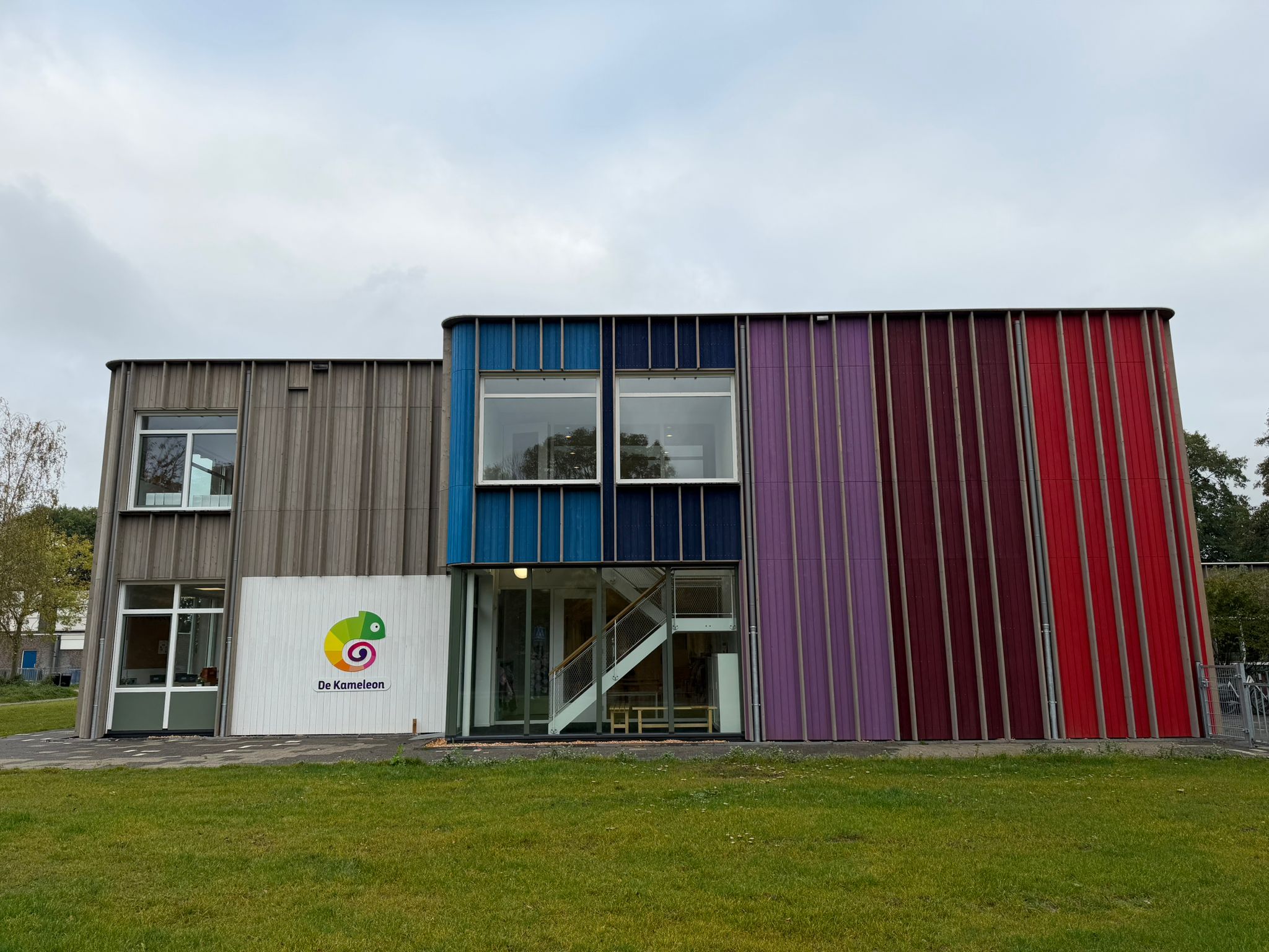 De gevel is opgebouwd uit thermisch gemodificeerd naaldhout, zorgvuldig toegepast in twee verschillende profielen. Door het gebruik van meerdere kleuren ontstaat een levendig gevelbeeld dat bijdraagt aan de identiteit van het gebouw: